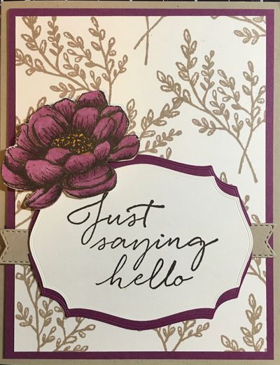 5. Stamp “Just Saying Hello” in Rich Razzleberry ink onto scrap Very Vanilla cardstock and cut out with one of the Tasteful Labels dies.